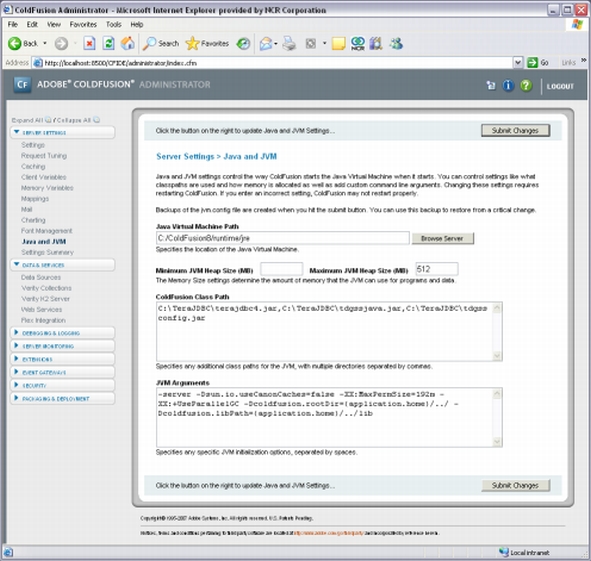 Click "Submit Changes" to apply these changes and restart the ColdFusion service to make them take effect.